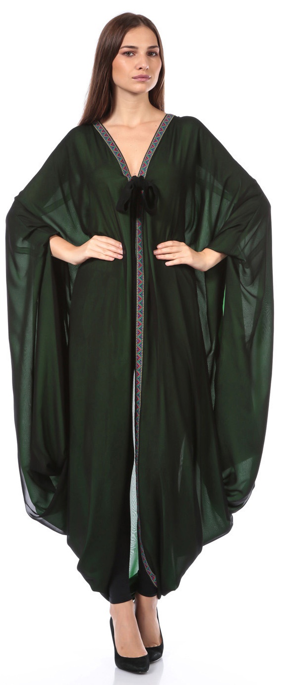 Double Chiffon Abaya with seamless collar, V bust, Functional Ribbon, empire waist and hidden belt with embroidered lace on front part of Abaya 175$.